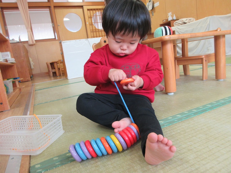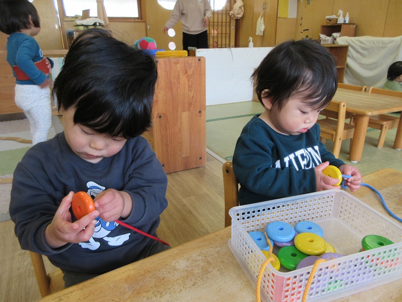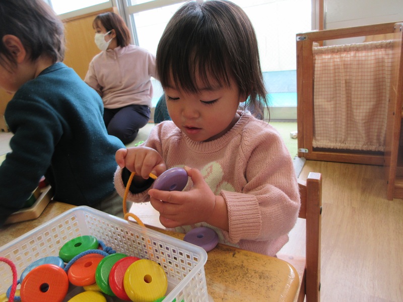 - 新しくひも通しを出し、保育士と一緒にするととても真剣な表情で遊んでいました。穴にひもを通すことは難しいですが、通すことができると「できた!!」と嬉しそうに見せてくれます。たくさんのビーズを通す姿も少しずつ見られています。