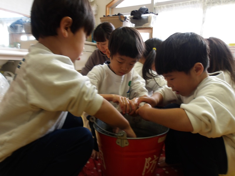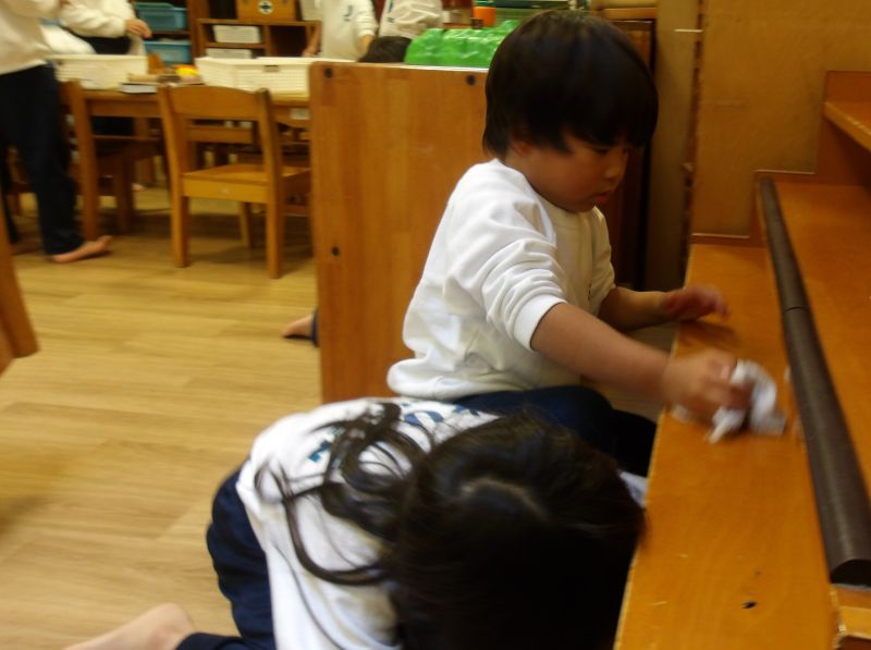 - 個人のロッカーやおもちゃの棚、椅子や床の拭き掃除をしました。汚れの付いた雑巾をみて「こんなにいっぱい拭いたで」「ここも拭いた方がいいかな?」と楽しみながら大掃除をしました。最後に「今日は雑巾がけ大会するやんな?」といって楽しみにしていた雑巾がけ大会を開催!一年の汚れを落としました。