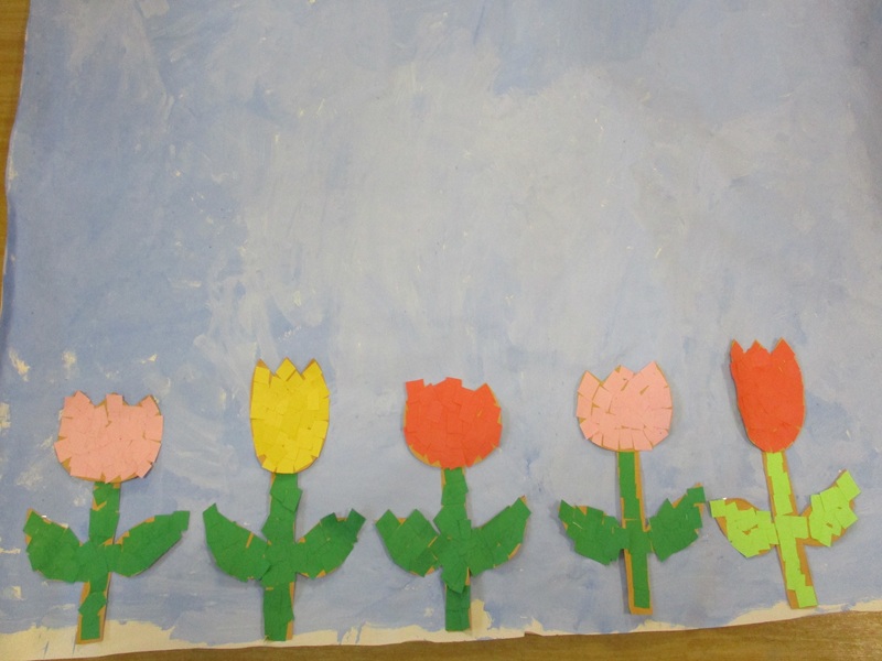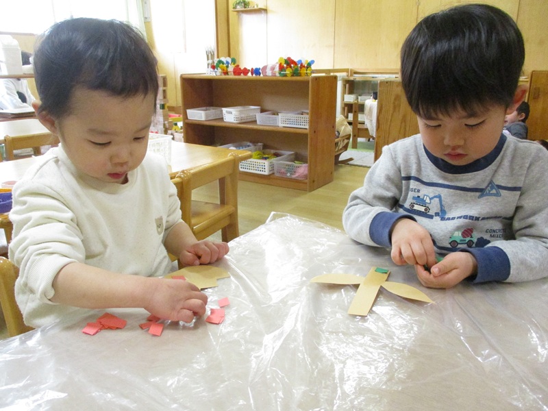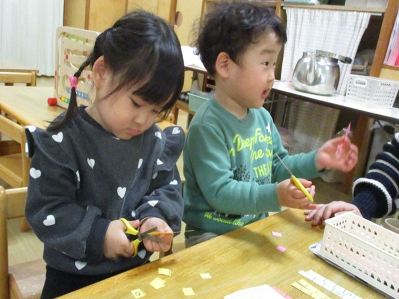 - ベランダのチューリップが芽を出し、「赤いお花がいいなぁ」「ぼくは黄色がいい」と自分の好きな色を思い浮かべてチューリップ作りが始まりました。初めてのはさみに真剣な表情で取り組む子どもたち。上手に切れたときは「できた!」と嬉しそうな様子も見られます。のりでペタペタ、自分が作ったチューリップを飾り、暖かくなって花が咲くのを楽しみにしています。