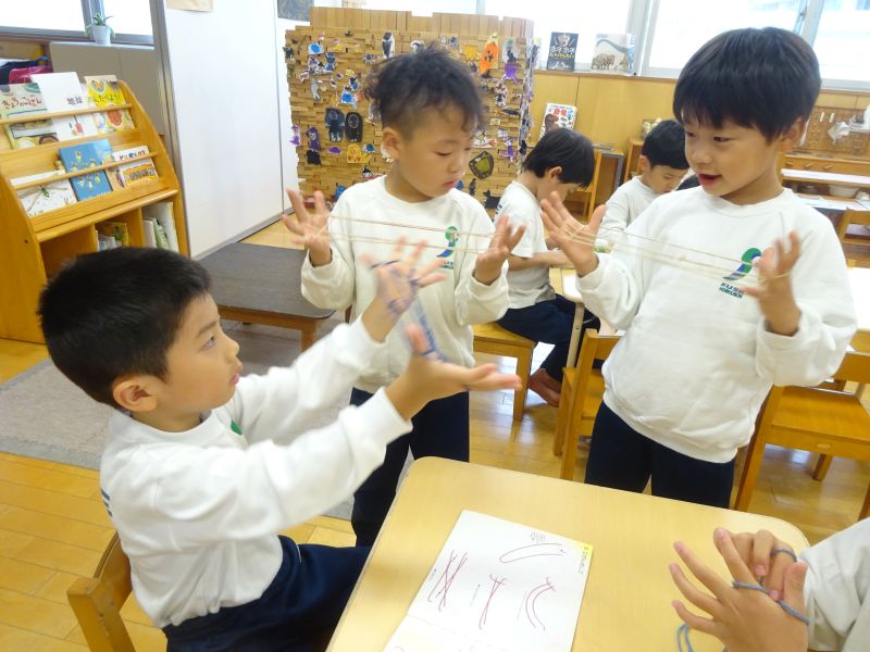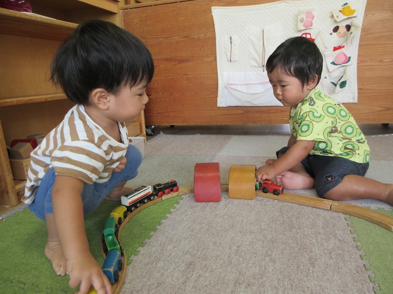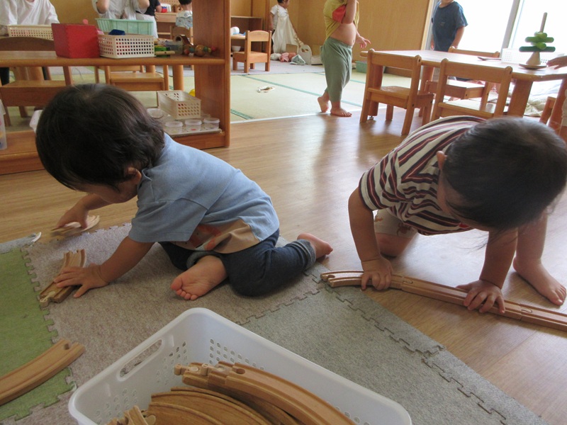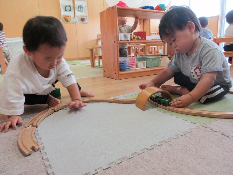 - 汽車に付いている連結部分の磁石の向きを考えながら、長く繋げて遊べるようになってきました。また、線路に付いているジョイントを工夫しながら作っていけるようになりました。友達が遊んでいる姿を見て同じようにする姿も見られています。