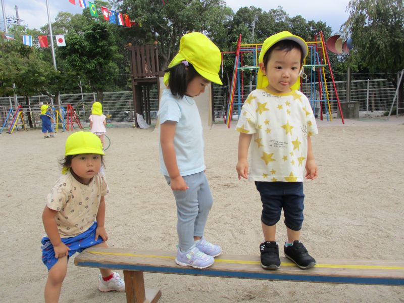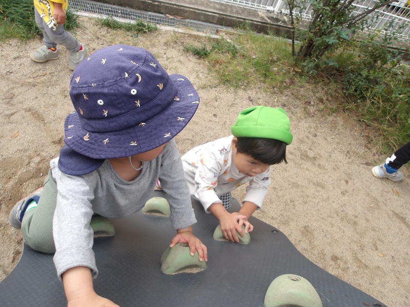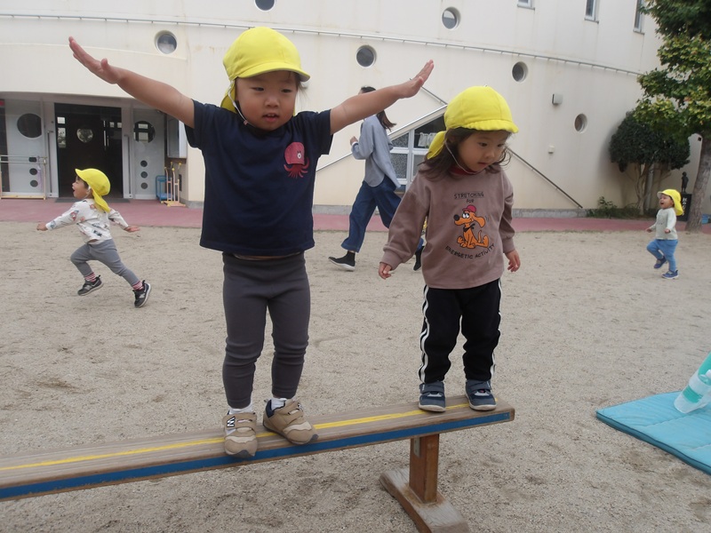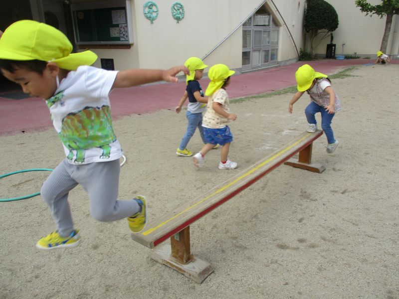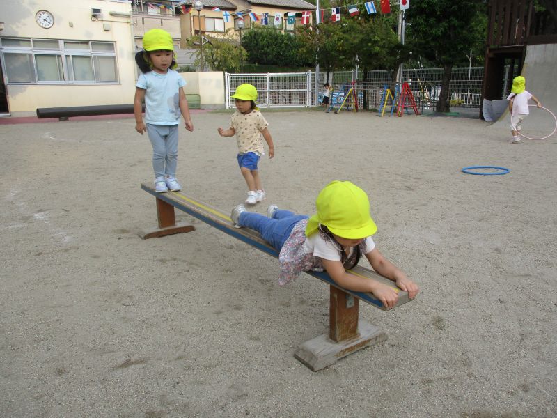 - 幼児園庭に降りて、様々な遊びを楽しんでいます。「よーいどん」と走ったり、平均台を「おっとっとっ」と言いながら落ちないように渡ったり、、、クライミングでは、手や足をかける場所を考えながら登っていました。