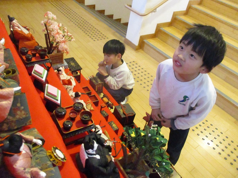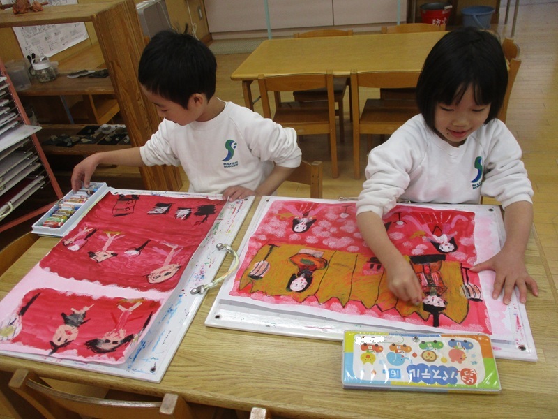 - 先週、自分たちで飾ったお雛様。歌をうたいながら、毎日前を通って見ています。じっと見るうちに見つけることも多く、細かい所も思い出しながら描いていました。