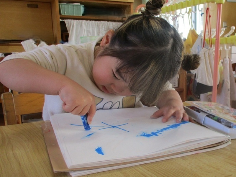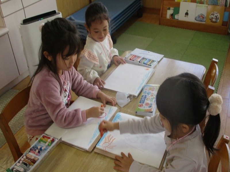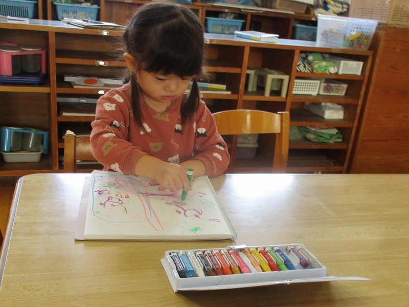 - ずっと楽しみにしていた自分だけの画帳。11月より使いはじめ、〇×△など形を描いてみたり、友だちの絵を見て「私も…」とまねしてみたりと、日々楽しんでいます。