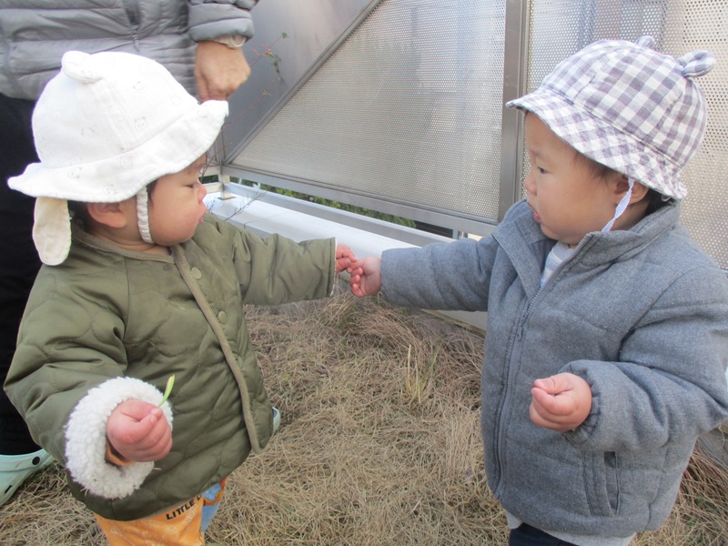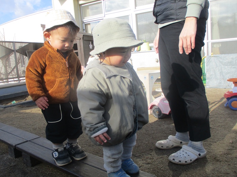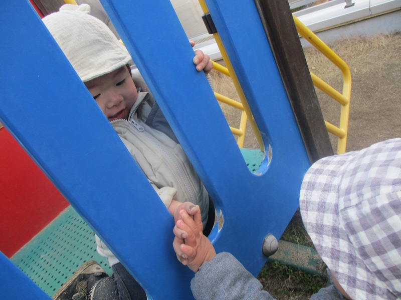 - 友だちに落ち葉を「どうぞ」と手渡したり、滑り台の隙間から顔を覗かせタッチをしたり、ローベンチを友だちと一緒に「そろりそろり・・」と慎重に歩いたりする姿がありました。