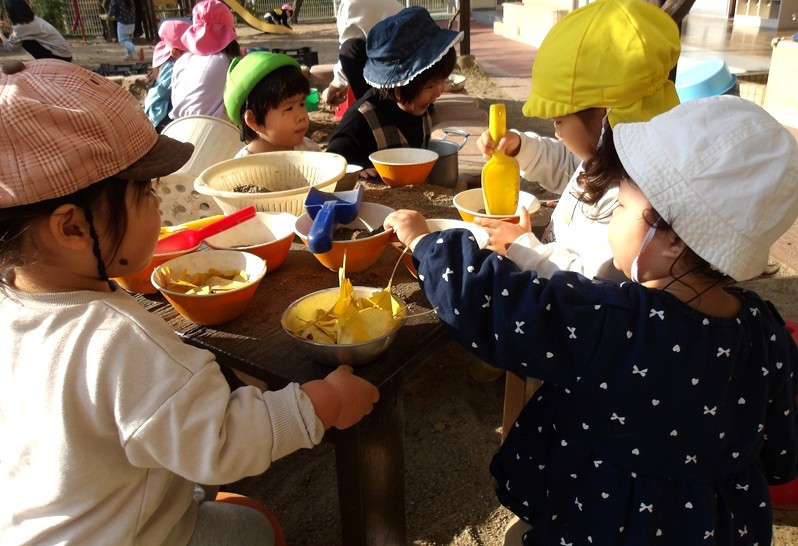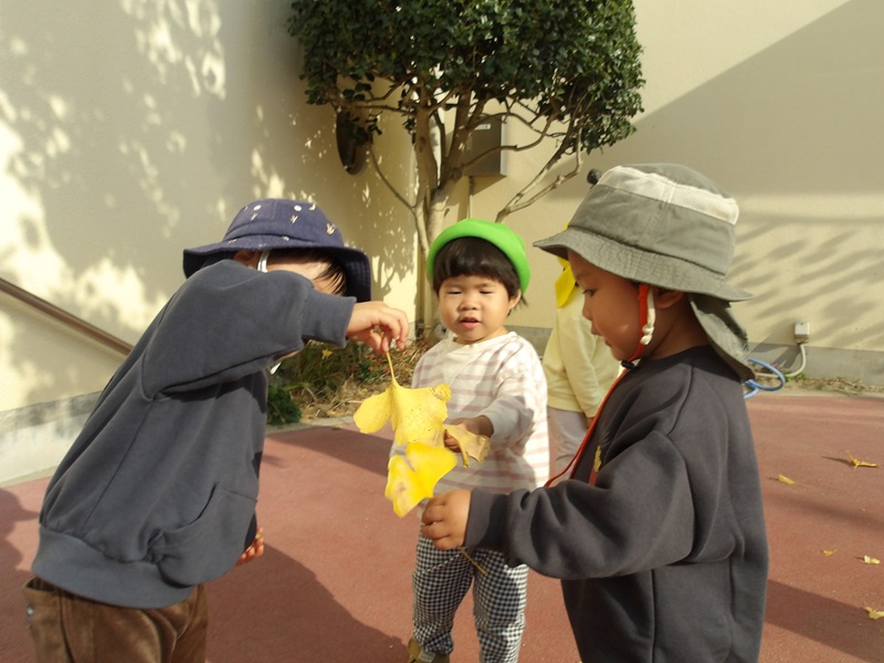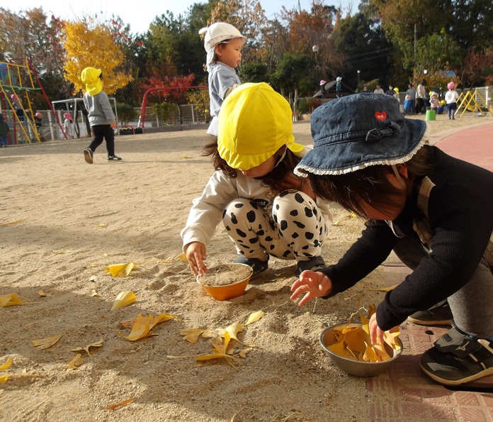- イチョウの葉を集めて遊びました。友だちと「きいろあったね」「いっしょ!」と同じが嬉しい子どもたちです。その後はイチョウをテーブルまで運び「ごはんだよー」「〇〇ちゃんもたべていい?」とままごとを楽しんでいました。