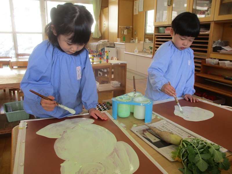 部屋に持ち帰り、大根をじっくり見ながら絵具で描き、