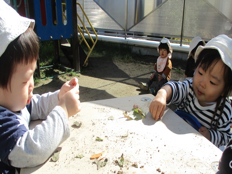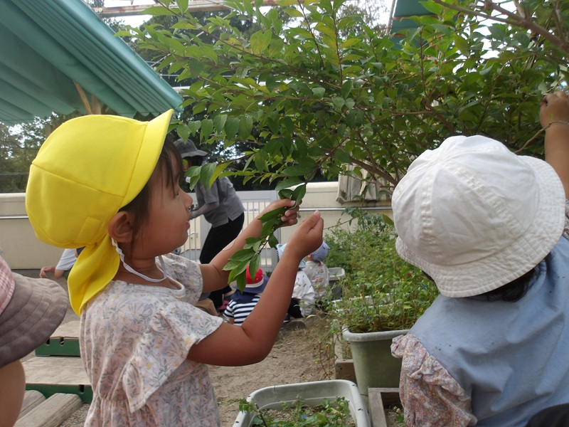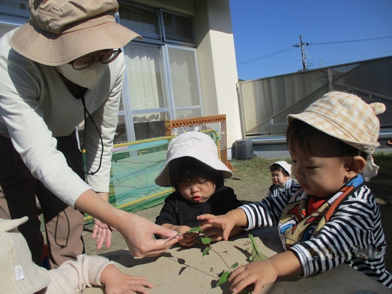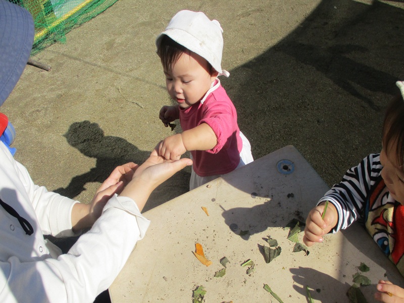- 園庭で見つけた葉っぱを「どうぞ」と手渡すと興味を示し、両手で細かくちぎったり、保育士に手渡したりしてくれました。「ちぎちぎぱっぱ」と言葉を添えると、同じように「ちぎちぎぱっぱ」と言おうとしたり、ちぎる音を聞いたりする姿がありました。