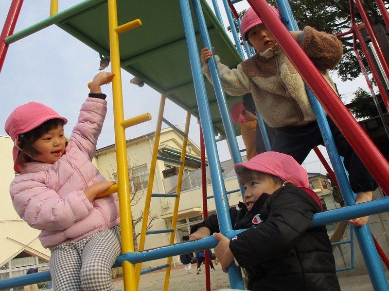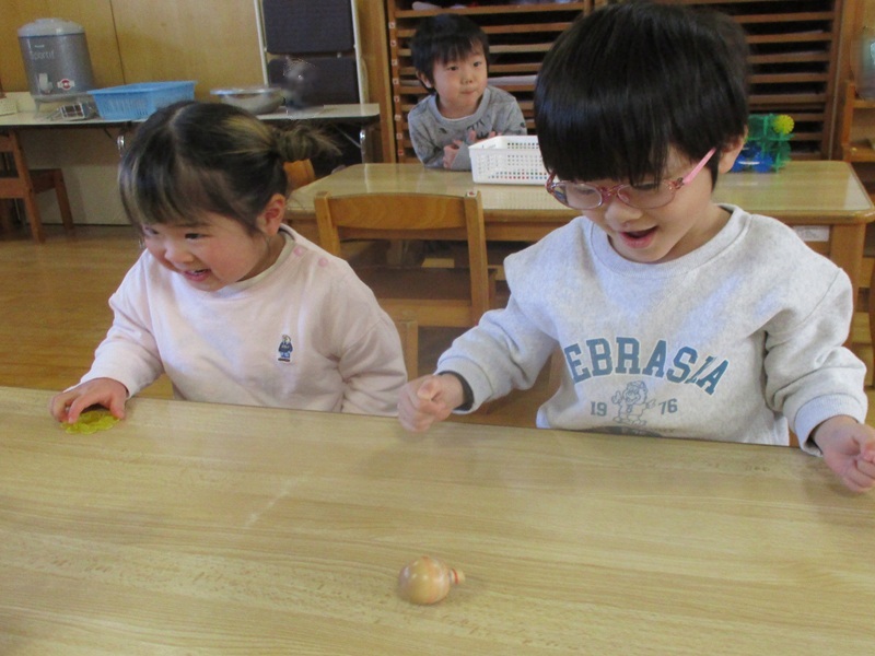 - 戸外ではジャングルのぼり棒をして体を動かしたり、三角形の玩具をおにぎりに見立てお店屋さんごっこをしたりと、久しぶりに会った友だちとたくさん遊んで過ごしました。室内ではコマを手に取り、「これおばあちゃんとやった」「やってみる!」と回してみる姿がありました。