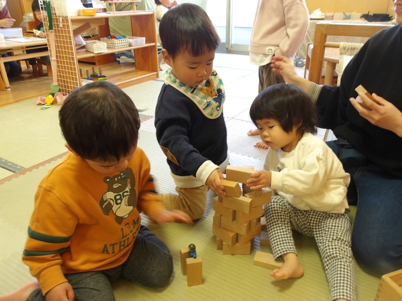 - 積み木を組み合わせたところに人形や動物を置いて「ここがかばさんのおうちで~」など、友だちと話しながら並べたり、保育士が交互に積み木を積むと同じように積んで高くなると…「どっちがおっきい?」と背比べも楽しんでいました。