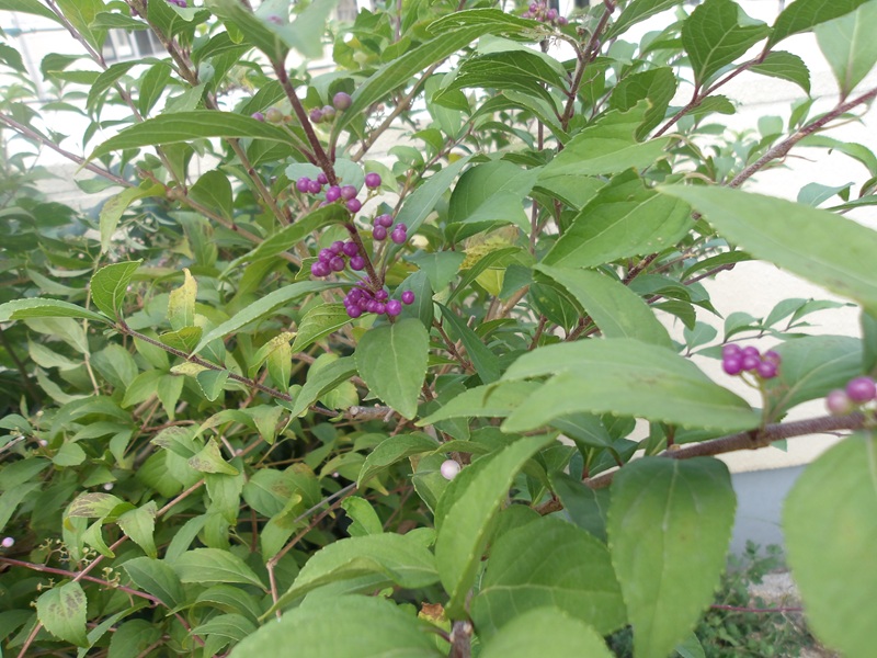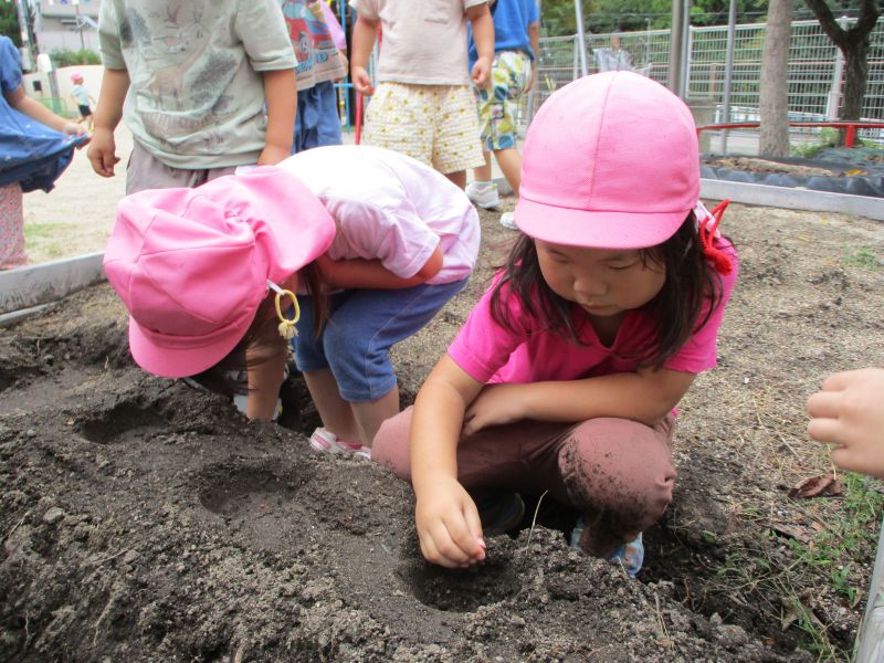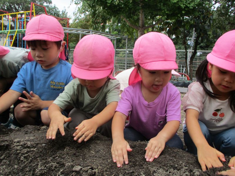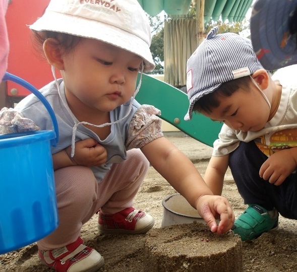 - ムラサキシキブの実が紫になり、集めて楽しんいます。保育士が「ブドウみたいだね」と声をかけると「ブドウ!」と嬉しそうに砂のケーキにのせて”ブドウのケーキ”を作っていました。