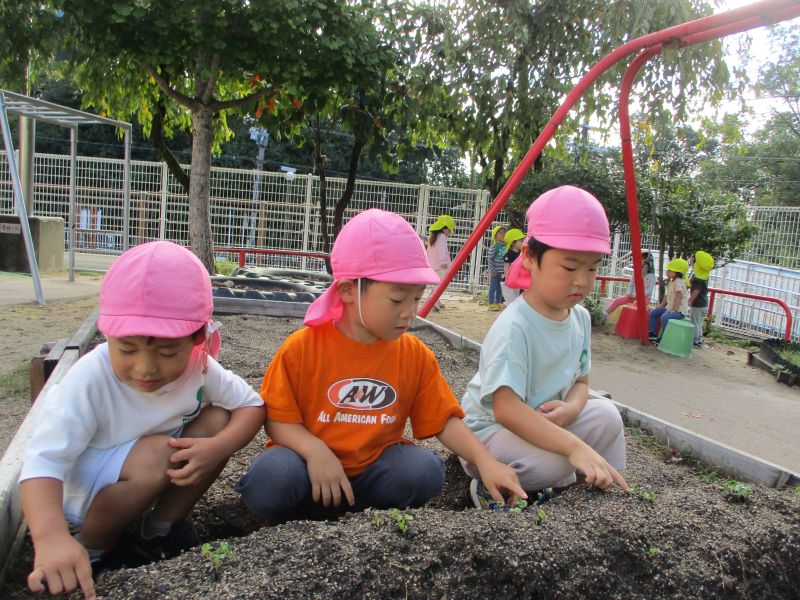 「大根の芽が出てる!!」と呼びに来てくれ、少し触ってみました。