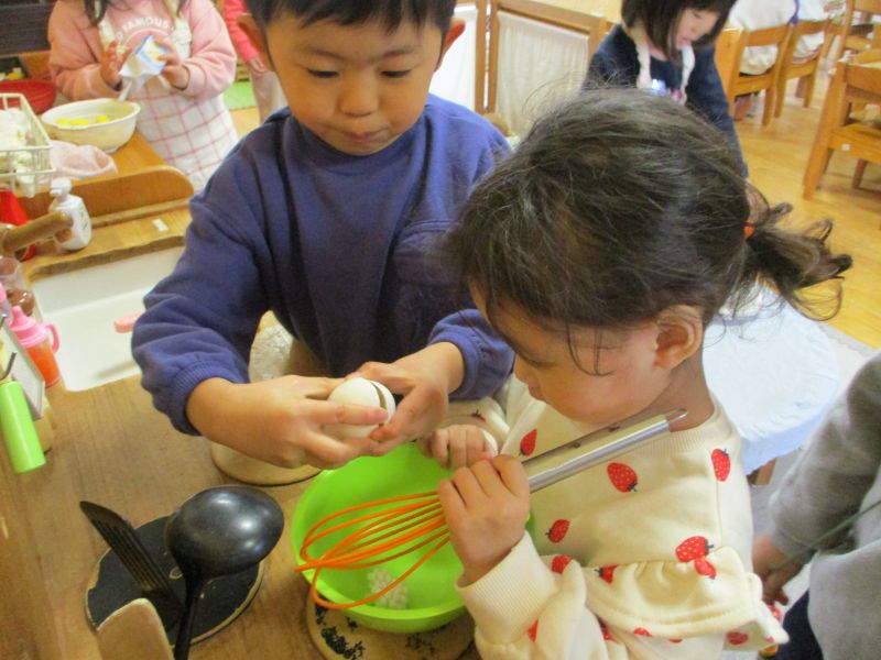 卵を割って…かき混ぜて…と、友だちと協力したり