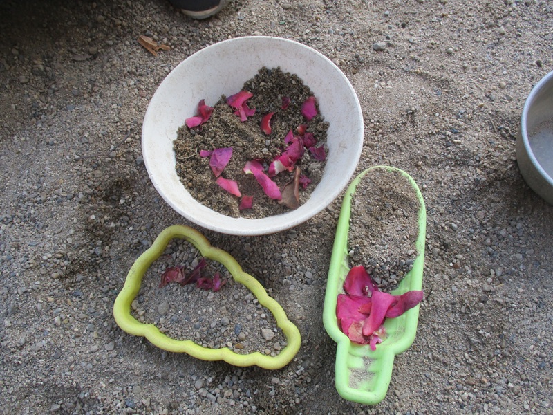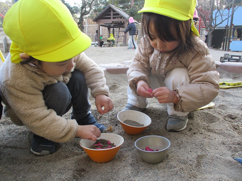 - きれいに咲いたサザンカの花びらが落ちているのを見つけました。「ここにもあったよ!」と集めた花びらをままごとの料理に飾り付ける子どもたち。「カレーライスつくった!」「ふりかけかけよう」と花びらの色や形を工夫して遊んでいました。