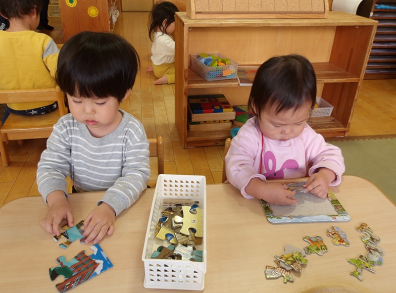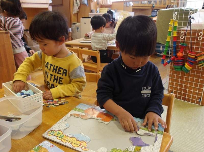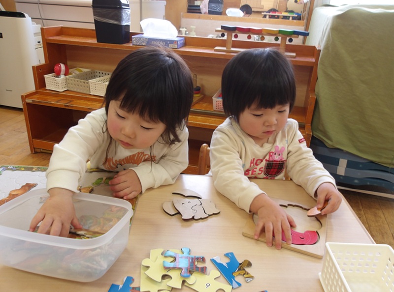 - 少しずつ色や形を捉えられるようになり、悩みながらもピースが多いパズルにチャレンジする子どもたち。完成したパズルを見て「ダンプカーや!」「これはカバさん~」と名前を呼びながら楽しんでいます。