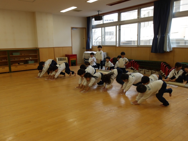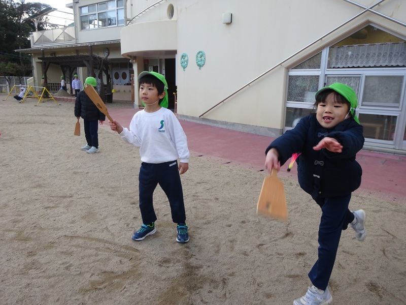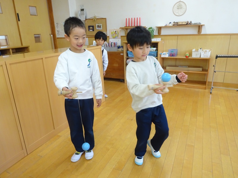- 「ひとめ~ ふため~・・」と数え唄を歌いながら、羽根つきをしたり、「よっ!」と膝を柔らかくしてけん玉に挑戦。百人一首は、「蝉丸でるか・・・」とドキドキしながら、坊主めくりを楽しんでいます。