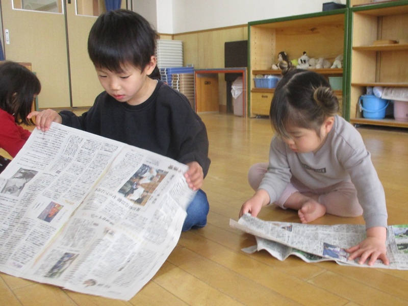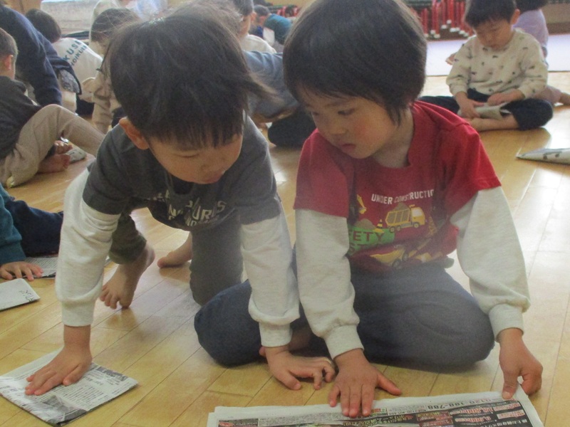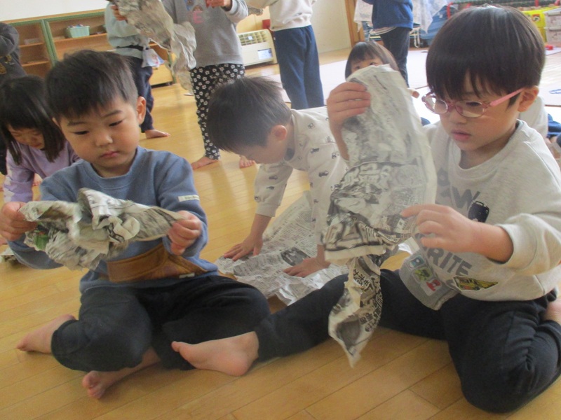 - ひまわり組(3歳児) 新聞紙を・・・
