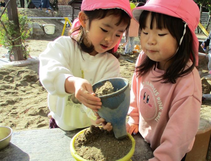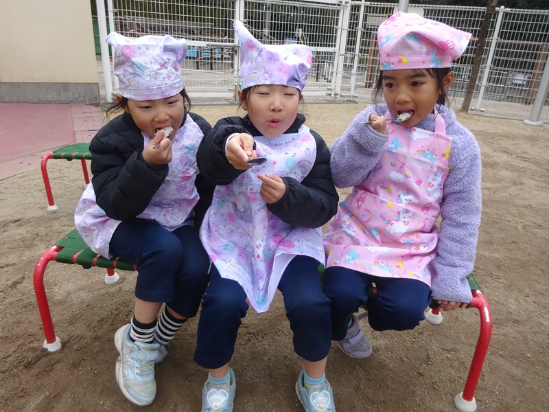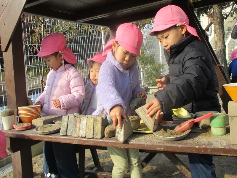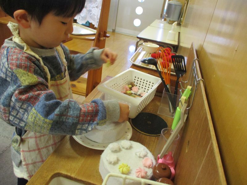 - 「ケーキ」の絵本を読んでから、室内や戸外でケーキ作りが始まりました。