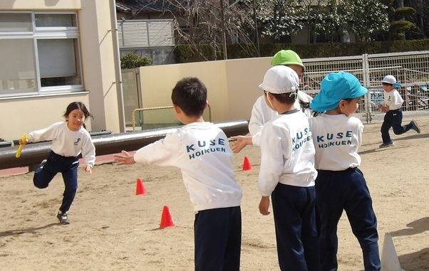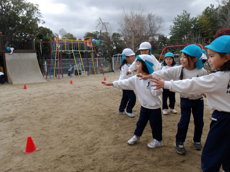 - 「はやくはやく!」「がんばれー!」と友だちに声援を送りながら楽しんでいました。勝負が終わると「次は一番に走っていい?」「白チームにかわるで」と、子ども同士で順番やチームを決めて繰り返し走っていました。