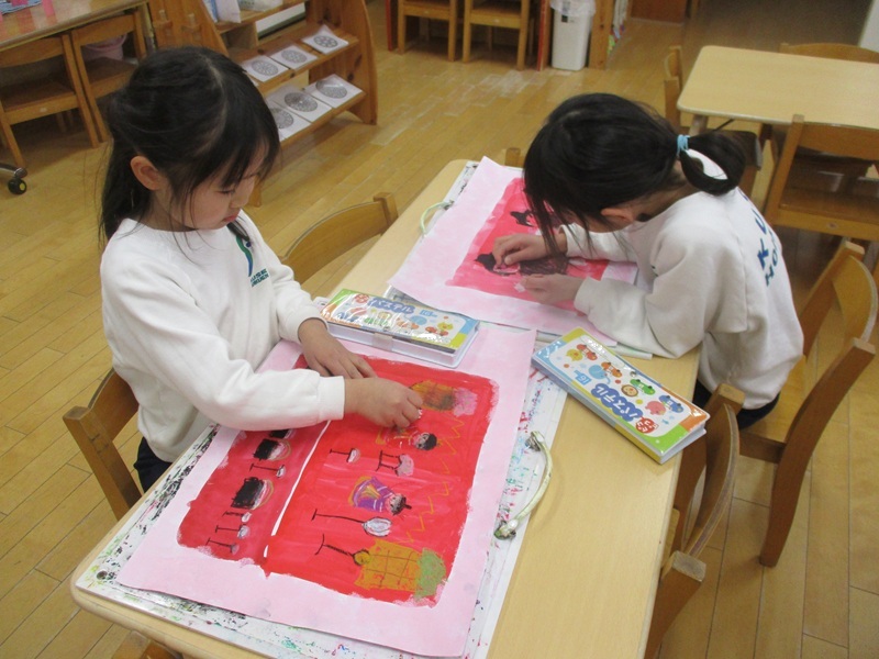 - 劇あそびをする中で、「ここは、こんな色もいいんじゃない?」「〇〇にしてみたら、どうかな?」など、アイディアを出し合いながら、背景や大道具、小道具作りが進んでいます。保育園最後の発表会、みんなで楽しんでいきたいと思います。