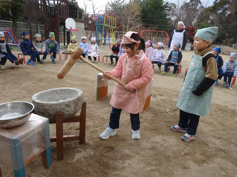 - 「昨日洗ったもち米、どうなっているかな?」と待っていると、ほわ~んと蒸しあがったお米のいい匂い。鼻から大きく息を吸い込んでから味見。「もちもちしてる」「よく噛んだら、お餅になるかも」と蒸したてならではを味わいました。そして掛け声と共におもちつき。つやつやのお餅がつきあがりました。乾燥させて、揚げもちでいただく予定です。