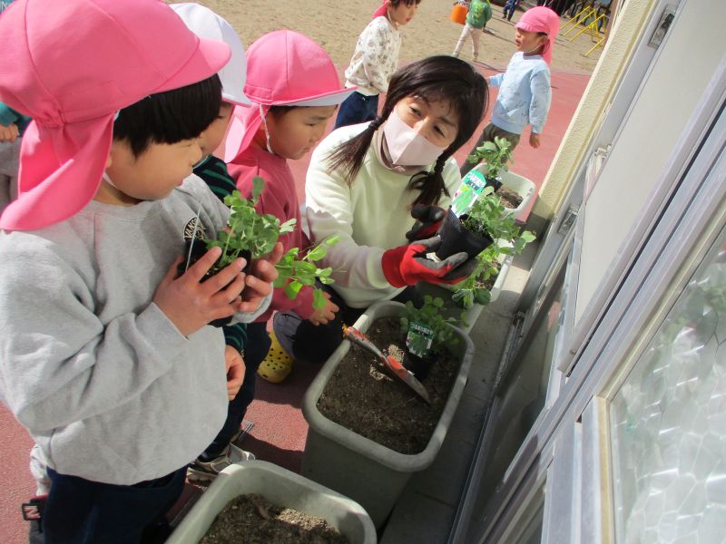 - 園庭にそら豆の苗を植えました。部屋に戻って、絵本「そらまめくんのベッド」を読むと「さっき植えたやつや!」「そらまめくんに早く会いたいね」と嬉しそうに話していました。次の日、早速水やりする子どもたち。きく組ひまわり組になって収穫できる日を楽しみにしています。