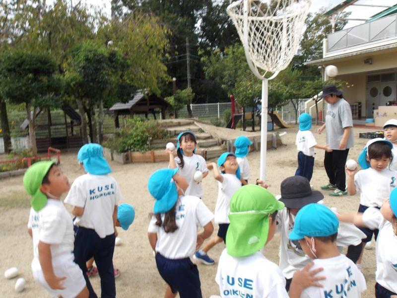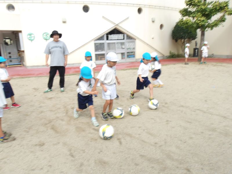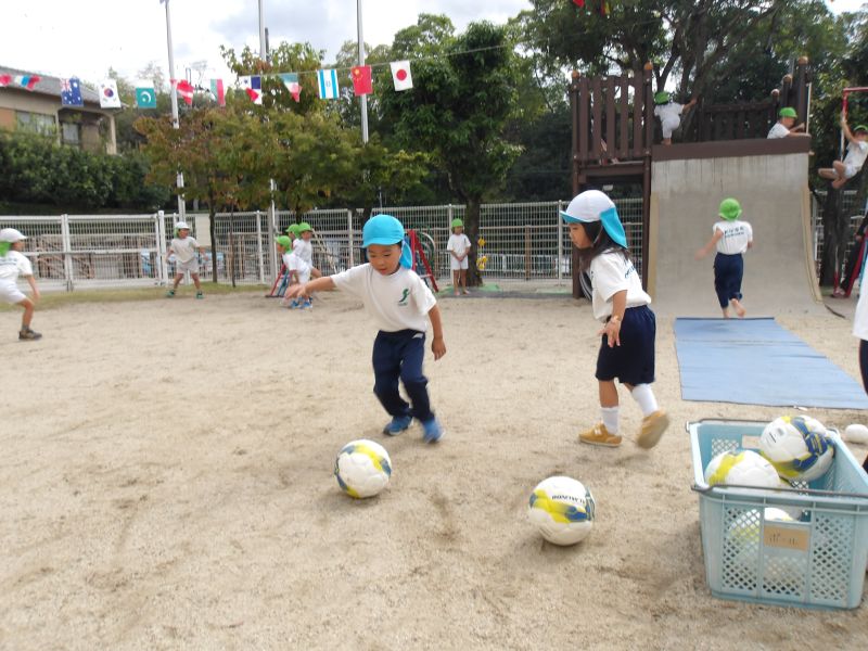 - 走ってきた勢いで力いっぱいボールを蹴り、ゴールが決まると「やったー!入った!」「強くけれた!」と言って何度もシュートをしていました。玉入れでは、子どもチーム対保護者チームで勝負をするときのために特訓をするなど、運動会を楽しみに待っている子どもたちです。