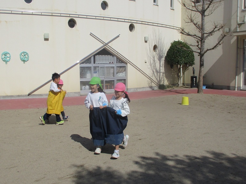 - もうすぐ卒園するゆり組と、きく・ひまわり組はデカパン競争、すみれ組はリレーをしました。一緒に身体を動かしたり、応援しあったりと交流を楽しむ中で、「遊んでくれてありがとう」と伝える姿もありました。