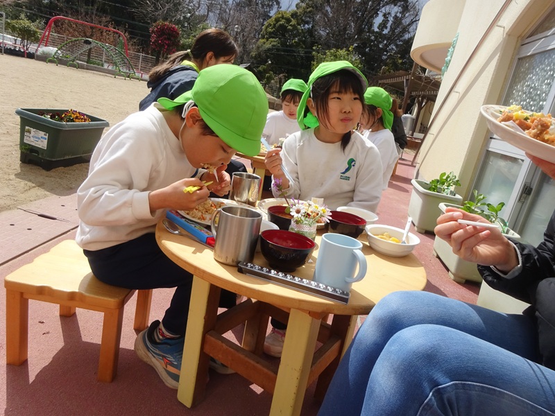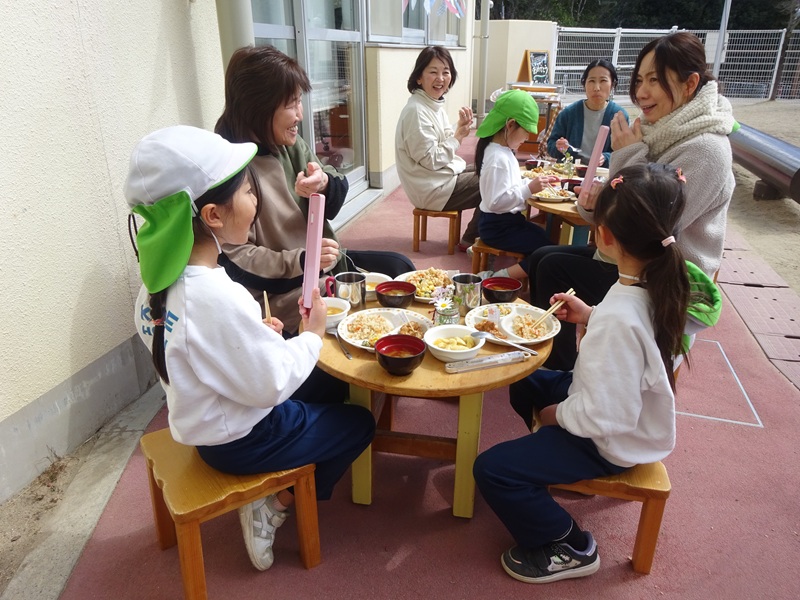 - 来週、卒園式を迎えるゆり組。「卒園おめでとう」「〇〇小学校に行く」「ぼくは、〇〇のご飯が好き」など会話を楽しみながら、事務室、給食室の先生と一緒に”おめでとうランチ”を頂きました。