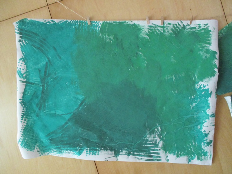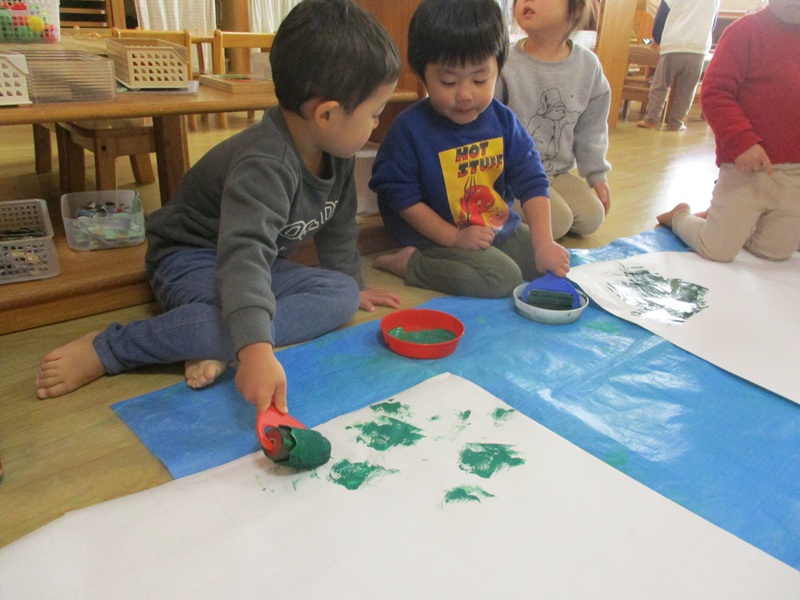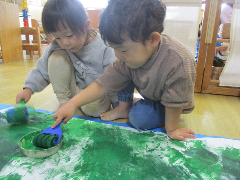 - えのぐあそびを楽しみました。三色の緑色を用意すると、「ぼくの緑と違う色だね!」と友だちと話しながら、ローラーでコロコロ…。真っ白だった紙が一面緑になるまでじっくり楽しみました。これから何ができるか楽しみです。