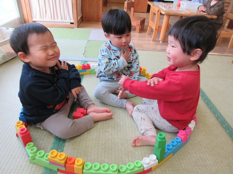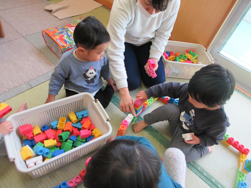 - 『もりのおふろ』の絵本が大好きな子どもたち。保育士がソフトブロックを使ってお風呂を作りだすと、興味をもって一緒に作ってくれました。れんげ組のおふろが出来上がると友だちと入って「ごしごし しゅしゅ」と体を洗う姿がありました。