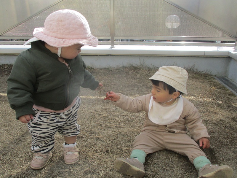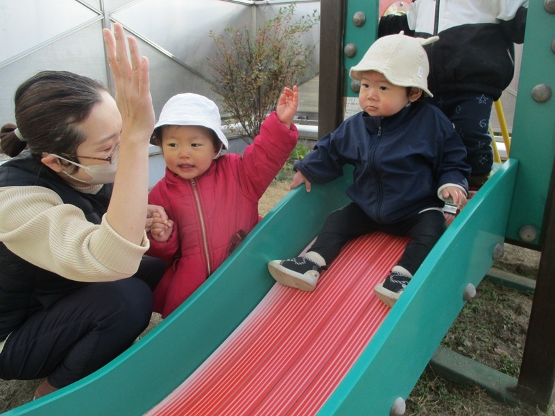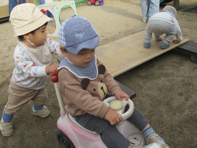 - 友だちとの関わりを楽しむ姿が増えてきました。友だちが滑れるように「カンカンカン」と言いながら手を上下させたり、ブービーカーを後ろから優しく押してあげたりする姿がありました。