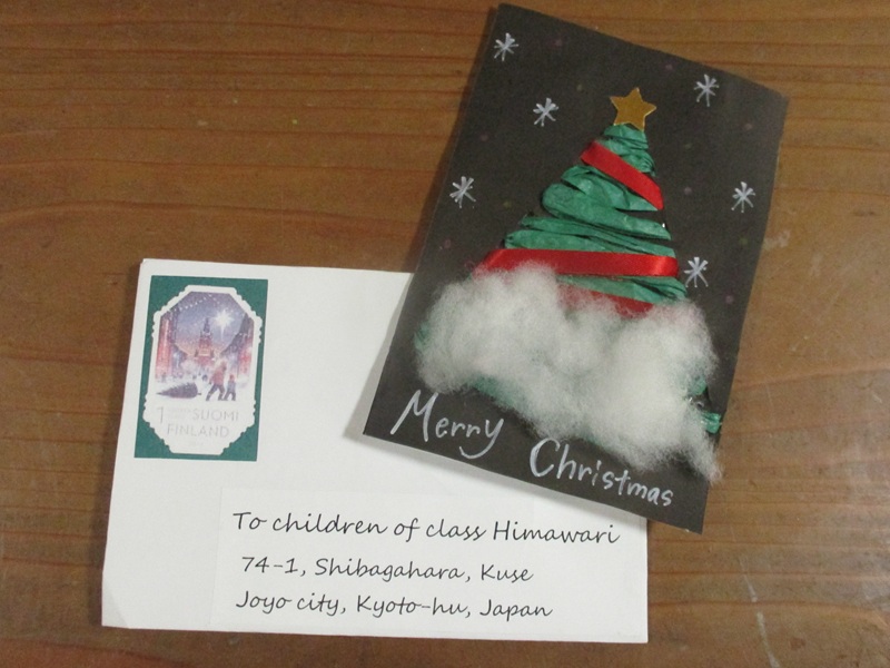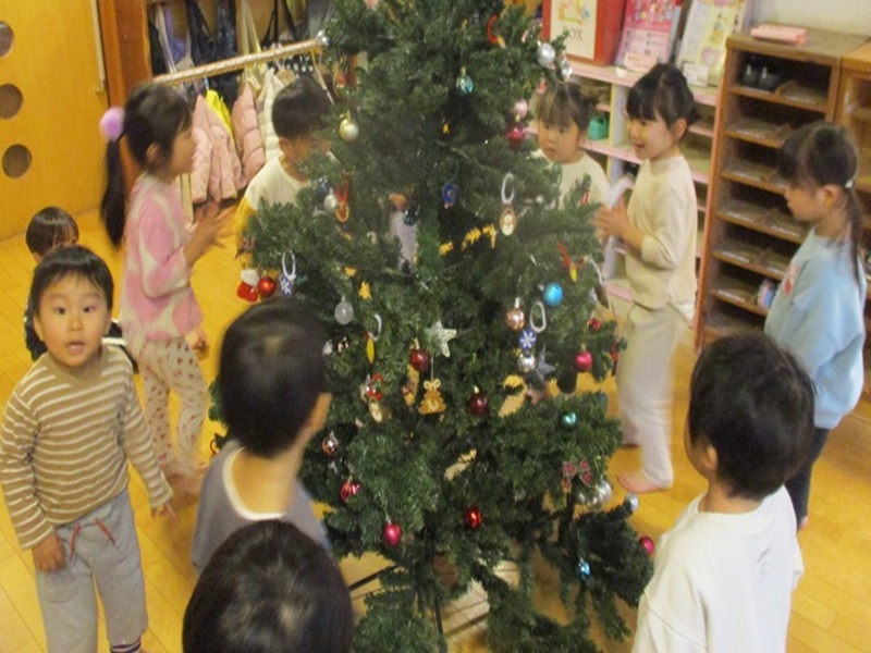 - ゆり組さんが「ツリーのところにあったよ」と、サンタクロースから届いた手紙を配りにきてくれました。早速読んだあと、手紙が発見されたクリスマスツリーを見に行きました。「ここに手紙あったんだって!」「キラキラいっぱいついてる!きれい…」と嬉しそうに話す子どもたちでした。