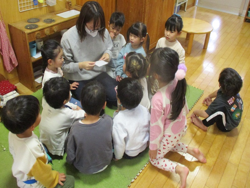- 「おもちゃのチャチャチャ」や「ジングルベル」を歌いながら楽器を鳴らすと興味を持ち、マラカスや鈴など、好きなものを選んで一緒に鳴らして楽しんでいました。もう1回!と伝えると、何度も鳴らして見せてくれました。