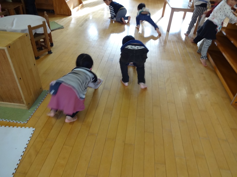 - 昨日、幼児クラスの子どもたちが平均台を渡っているのを見ていた乳児クラスの子どもたちが、今日はチャレンジする姿が見られました。まだ、立って歩くのは難しく、初めは座って遊んでいたのですが、お尻を滑らし徐々に前に進んでいくようになりました。そのうちに四つ這いになり、進み始めました。大人に助けを求めることもせず、それぞれ自分の発達に応じた渡り方で取り組み姿を見て、しっかり体で感じているんだなあと思わせる場面でした。