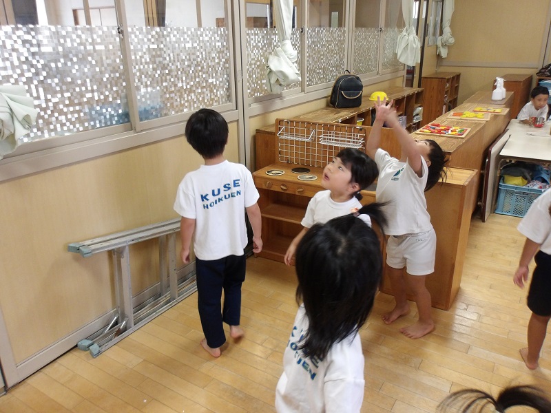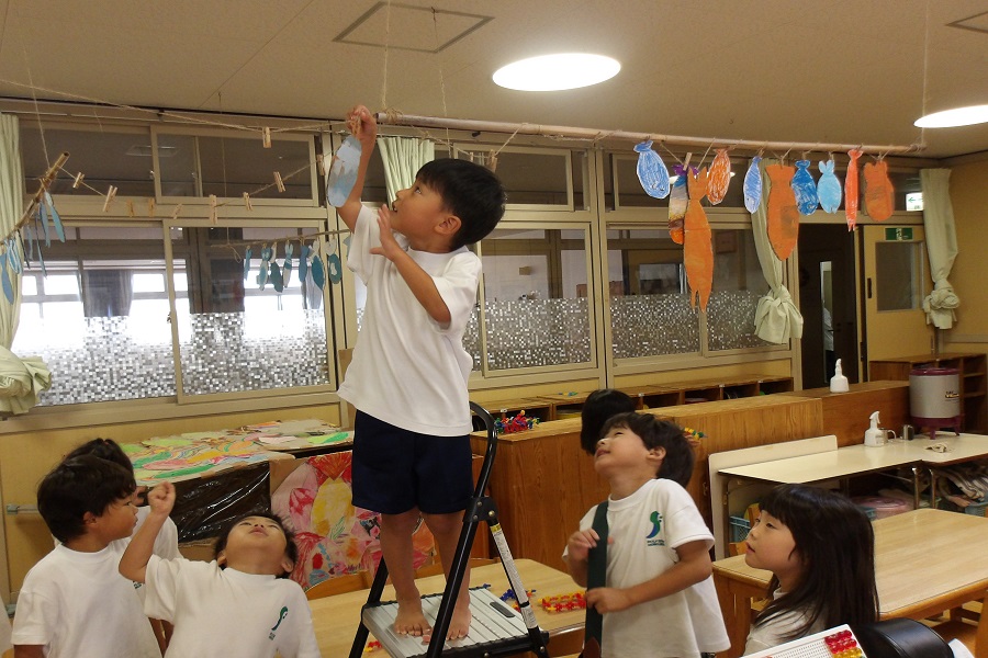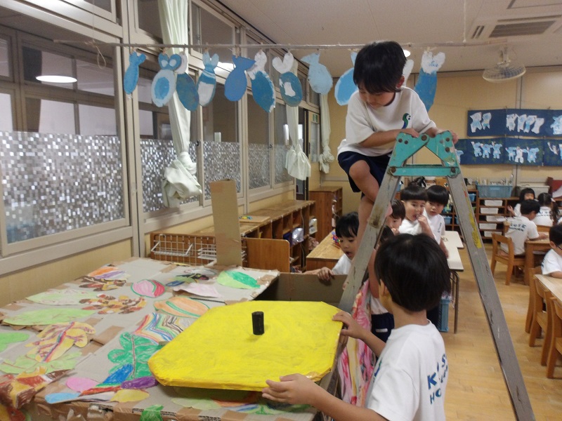 - 先日から作っている「そらとぶふね」が完成し、宇宙で食べる魚の干物もおいしく出来上がりました。「早くいってみたいなぁ」「いついく?」「ホンマに行けるの?」と盛り上がっています。子どもたちとの話の中で「明日魚を積み込んだり準備をして金曜日にいこう」ということになっています。