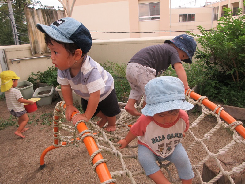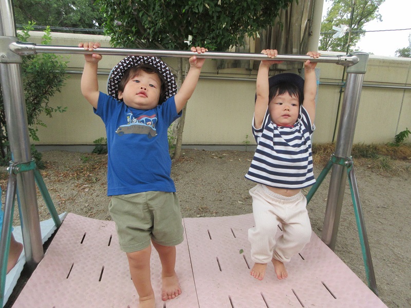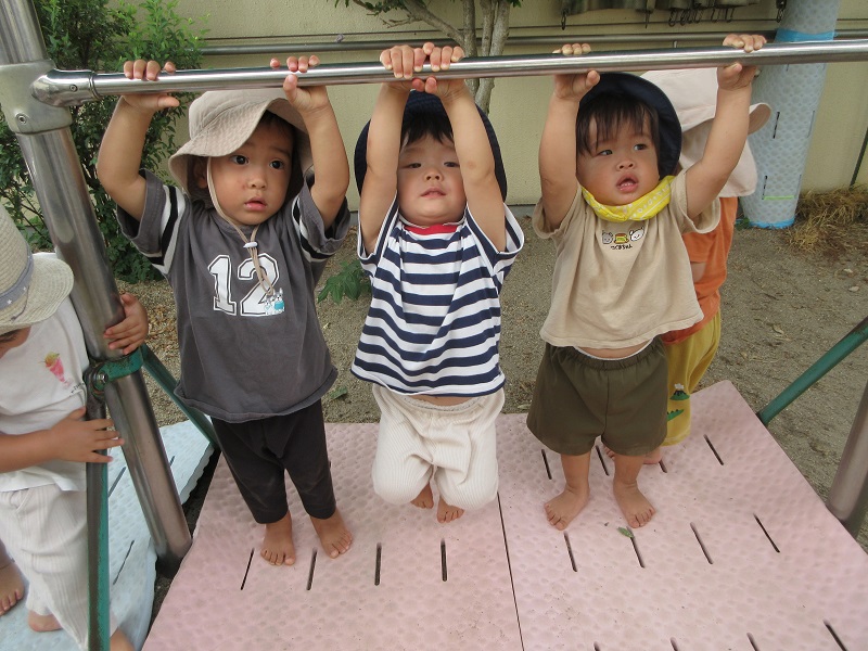 - 戸外では鉄棒や網太鼓橋をたのしんでいます。握る力がついてきて鉄棒にぶら下がったり、網太鼓橋に自分の体を支えながら上り下りが出来るようになってきました。友だちの様子を見て、一緒にやってみようとする姿も多く見られます。