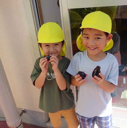 - 「やっとできた!」「見て見てとれたよ」と嬉しそうに収穫するすみれ組。早速、事務所へ持って行き報告。明日のシチューに入れてもらうことになりました。「早く食べたいな」と楽しみにしている子どもたちでした。