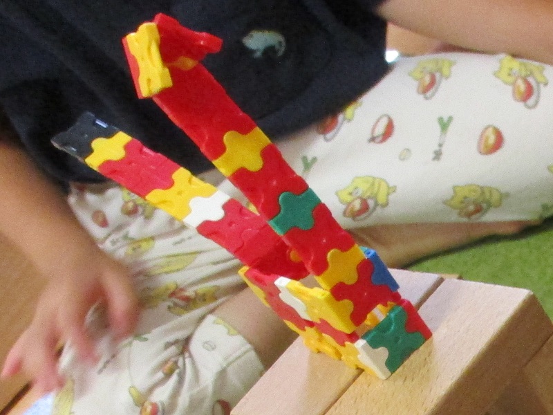 - 新しい部屋に少しずつ慣れてきました。汽車を走らせながらトンネルをくぐらせたり、自分でも線路を繋げてみようとしていました。ままごとではお玉ですくってお皿に入れたり、塩を振りかけて食べることを楽しんでいました。